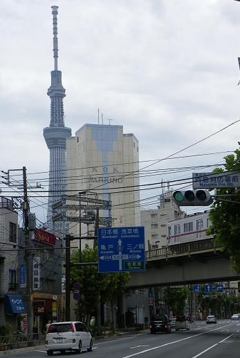 スイカイツリーの建設現場を右にみて、北へ急カーブを描くあたりから、いろいろな鉄道路線が絡み合ってきます。地下鉄半蔵門線から押上駅を経てきた線路が、地下からせり上がってきて上下線の間に分け入り、直ぐ脇をかすめた京成線の下をくぐってきた亀戸線がさらに合流し、3路線併せて曳舟駅に入ります。周辺は、いかにも「昭和」のイメージそのままの商店街と、工場跡地に新築された高層マンションとが隣り合っています。