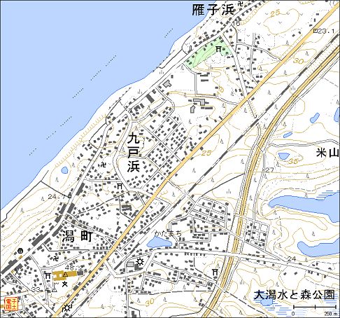 海岸砂丘の上を、国道8号、JR東日本信越本線、北陸自動車道がほぼ並行に走り、信越本線犀潟駅から分岐する北越急行ほくほく線が頸城平野北部を横断しています。鵜の浜温泉へは、信越本線の潟町駅下車、北陸自動車道では柿崎ICから国道8号を南西へ約5kmのところです。北越急行線に乗ると、米山(993m)を北に見ながら160km/hで駆け抜け、頸城平野の地形の成りたちと、内陸に向かって積雪が急に増す様子とが、短時間で一覧できます。