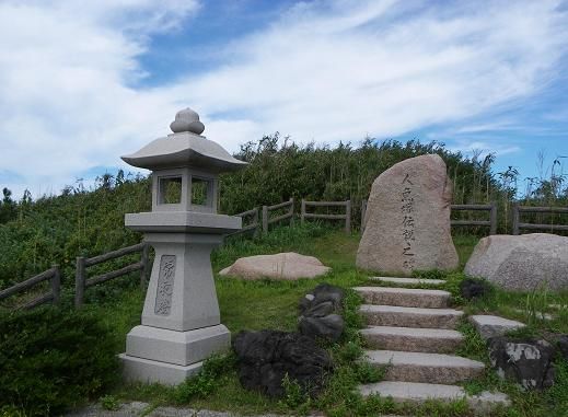 人魚像から北へ数百メートルの雁子浜に人魚伝説の碑があります。元の人魚塚は近くの別の場所に現存しているようなのですが、こちらは1993(平成5)年に小さな公園として整備されました。維持管理はされているようですが、冬は日本海からの寒風が吹きつける環境で、ちょっと荒涼とした雰囲気です。