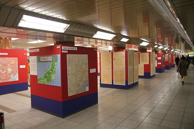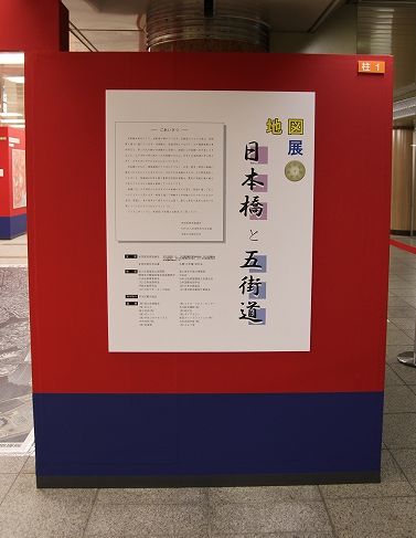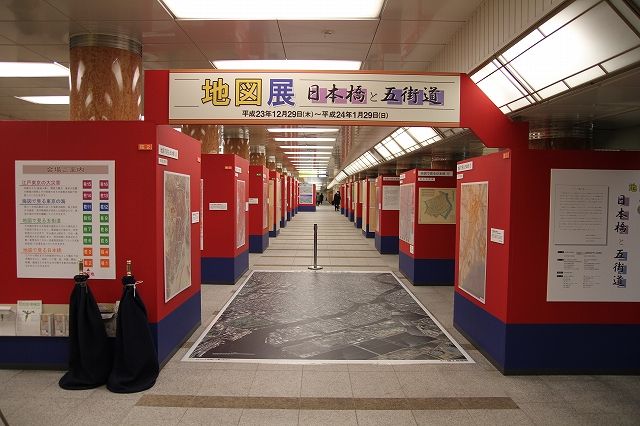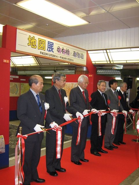 「地図展」は、地図にもっと親しんでもらおうと、毎年全国の主要都市で開催されている地図の世界の一大イベントです。主催は地図展推進協議会、(NPO)全国街道交流会議、名橋「日本橋」保存会で、会場は東京地下鉄(メトロ)三越駅前コンコース銀座線・半蔵門線連絡通路(国道4号地下歩道/東京都中央区日本橋室町)です。地図展としては初めて仕切りのない公共空間での開催となります。昨年29日から開催中の『地図展 日本橋と五街道』オープニングセレモニーが2012(平成24)年1月5日(木)に国土交通省国土地理院長、中央区 区長他約50名のご出席により執り行われました。