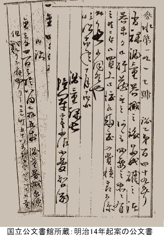 国立公文書館に保管されている、ドイツの測量機器購入に際して書かれた1881(明治14)年10月14日起案の公文書(図)には、「ベルリン府中リーニエン町五十八番地 カルルバンベルヒ発売」と住所と発売元が記されています。この器械購入文書の起案者は、後の初代陸地測量部長となる小菅智淵で当時、測量課長のときの直筆です。