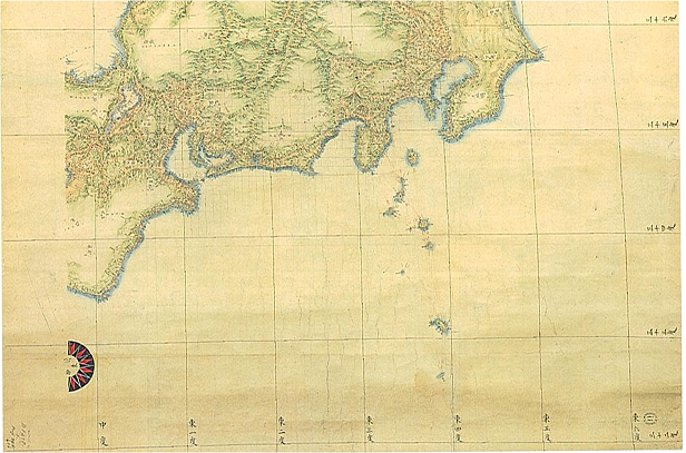 たとえば、1809(文化6)年「伊能忠敬幕府上呈の日本図」では、経度線は「京師(京都)を中度とし東西に分かつ」とあり、京都より東西に各1度ずつ経線が描かれ、「東四度」が東京付近、「西五度」が鹿児島付近に引かれています。