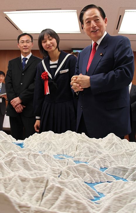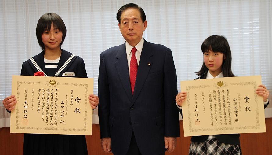 全国各地の「児童生徒の地図に関する作品展」の優秀作品の中から更に選ばれた「国土交通大臣賞」の揖斐川町立揖斐川中学校3年・山口愛加さん、「文部科学大臣賞」の神戸市立長坂小学校6年・小渕菜緒子さんが、太田国土交通大臣から表彰状と記念品が、1/14(火)に国土交通大臣応接室で、授与されました。